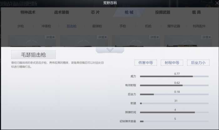 通过数据,我们可以发现,毛瑟狙击枪的伤害中等,射程中等,属于”中规中矩型“的狙击枪,而且后坐力较小,比较容易捡到,适合新手使用。