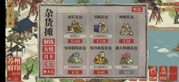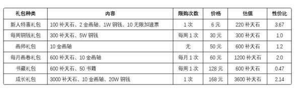 月卡>新人特惠礼包>成长礼包>首充双倍补天石>每月画卷礼包>画师礼包>每周铜钱礼包>补天石>书藏礼包