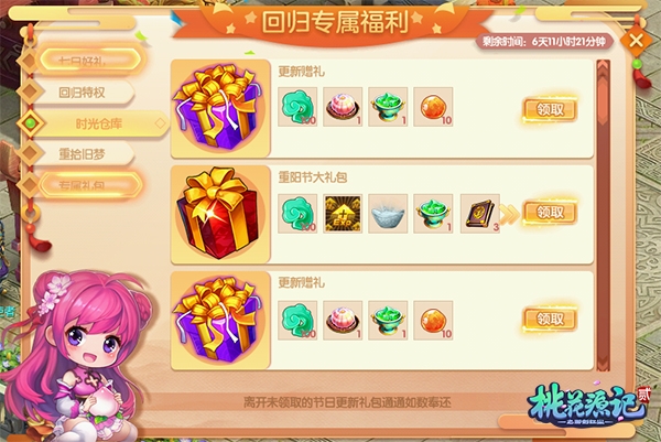 休息了一阵子再回到桃源,感觉错过了太多时光?大桃为你打开时光仓库,时光仓库珍藏了过去三个月所有的节日礼包和更新礼包,在回归活动期间只要上线,就可以领取过去三个月错过的所有礼包!