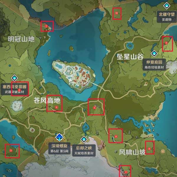 一共有10个蒙德地灵龛,分布情况如下图所示。