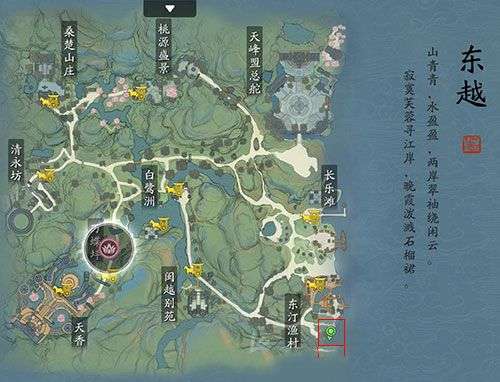 1、游戏中玩家前往东越的地图,具体位置就在右下角,小编为大家标出具体的位置了,玩家到达位置即可看见东汀渔村。