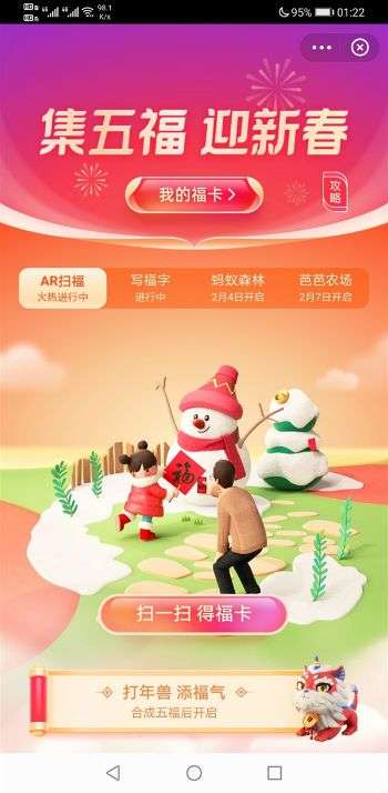 今年的集五福玩法共有四种,首批开启的是传统的AR扫福,手机镜头AR扫描任意福字都有机会得到福卡,而且扫薇娅送万能福、蒙牛乳业商标、海尔商标、一汽大众商标,可以额外得福卡。