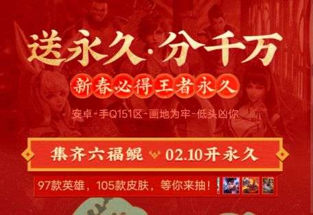 只需要集齐六福鲲,就可以在2月10日开出永久英雄和皮肤,包括97款英雄,105款皮肤。奖励还是很丰富的,值得参与。