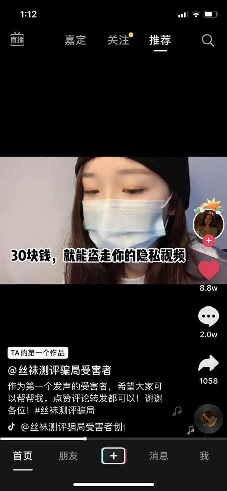 最近在抖音上有一位昵称为“丝袜评测骗局受害者”的用户曝光了自己遭遇丝袜骗局的经历,并引起了很多人的关注。