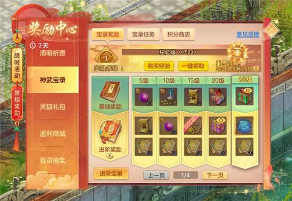 活动介绍:完成任务提升宝录等级,领取奖励。包含高级魔兽要诀、自选礼盒等多种奖励,更可从自选礼盒中挑选通灵符、幻彩花、卸灵符等极品道具。