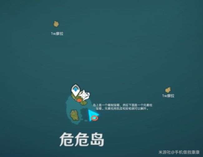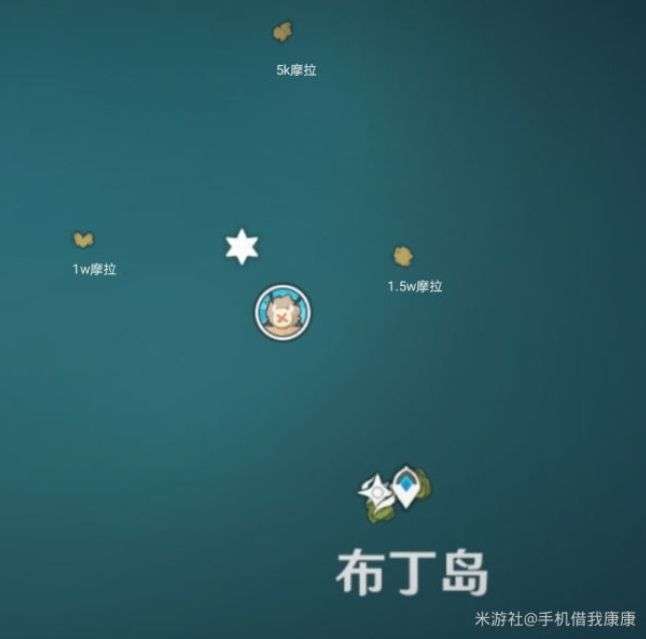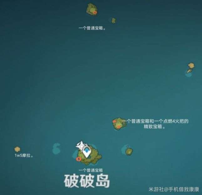 一共5个宝箱,然后最上面是一个普通宝箱,最左边是个摩拉宝箱。中间主岛有一个普通宝箱,然后在主岛的东北方向有两个宝箱,其中一个是火把解密宝箱。