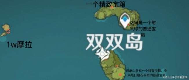 一共是5个宝箱,左边那个小岛上有一个1万摩拉的宝箱。然后上边的话那个岛,有一个精致宝箱。和一个热气球宝箱。下面岛上两座山头各一座精致宝箱,然后下来之后有一个破石头的普通宝箱。