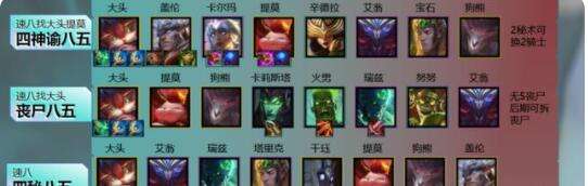 然后再根据8人口/9人口D卡情况,可去转下面几个大头为主C的八五、九五阵容。核心思路就是给大头加上抗性buff,如骑士、铁甲、秘术,加上输出buff 复苏、神谕者。以及前排:熊小菊复生体系等等,根据对手阵容输出属性进行调整即可
