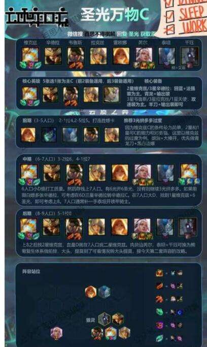 这套阵容是转天使/大头体系前的打工阵容。 当然去玩大头或者天使、打工阵容也不仅仅只有6光这一套,大宝之前写过的复苏魔女也可作为大头体系的打工阵容,这里仅对6光体系的过度,以及8人口的进阶转型进行讨论。