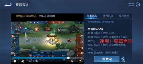 首先模拟裁决的题目是从题库中随机生成的,每个玩家的出题顺序都不一样,所以没有标准答案。只能根据视频中玩家的违规行为,选择【提交合适的裁决理由】,违规行为分类如下。(PS:确定某类违规行为后,可拖动进度条到末端直接裁定。)