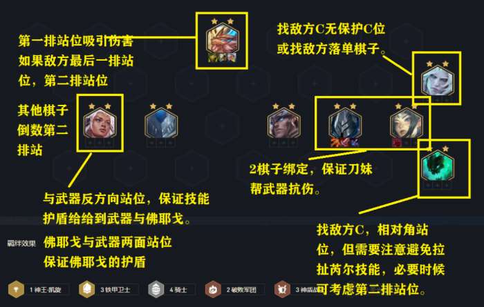 阵容主C是武器,武器是慢热型骑士,想要打出高输出就需要多次释放技能让武器获取高攻速,在达到3.0攻速以上携带饮血除非被连环控制,基本就不会死亡进而对敌方收割。阵容坦位主要是加里奥与刀妹,这两枚棋子技能均拥有高减伤搭配4骑士羁绊与坦度装备会非常肉,但不建议刀妹主坦,刀妹2费棋子血量较低,且减少还需要普攻,特别怕被控制。阵容后期另一个核心棋子就是佛耶戈,佛耶戈是对抗“养猪流”与赌锐雯阵容的关键棋子,1星佛耶戈就能转化敌方关键棋子,收益极高。