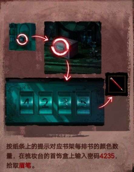 2、按纸条上的提示对应书架每排书的颜色数在梳妆台的首饰盒上输入密码4235,拾取眉笔。