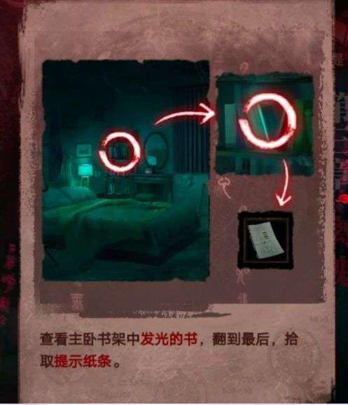 1、查看主卧书架中发光的书,翻到最后,拾取提示纸条。