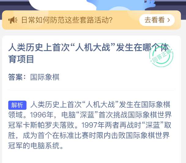以上就是人类历史上首次“人机大战”发生在哪个体育项目,支付宝蚂蚁庄园2025年6月22日答案最新,更多精彩内容,请点击关注pk游戏网更新!