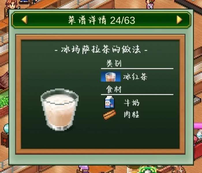 冰红茶品类的配方和红茶配方也是一样的,比如冰奶茶的配方仍然是一份牛奶,冰香料茶的配方也是一份肉桂,冰红茶品类一共有6款饮品,除了小编刚刚提到的2款,剩下的4款分别是冰印度奶茶,冰玛萨拉奶茶,冰苹果茶以及冰柠檬茶,配方请参考红茶系列的配方,这里小编就不过多阐述啦!