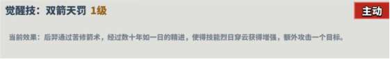 描述:后羿通过苦修箭术,经过数十年如一日的精进,使用技能烈云穿日获得增强,额外攻击一个目标。