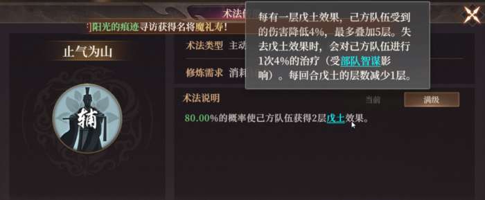满级80%概率全队获得2层戊土,也就是受到伤害降低8%,并且受到2次单回合4%的治疗。