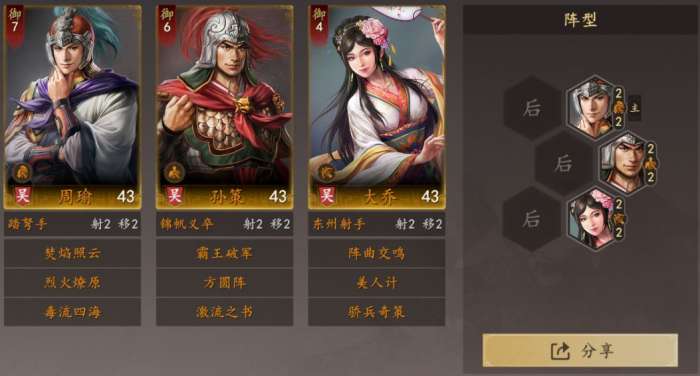 1、周瑜主将+方圆阵,确保基础速度偏慢的周瑜能每回合先手输出,前三回合超高的爆发将敌方主C打残