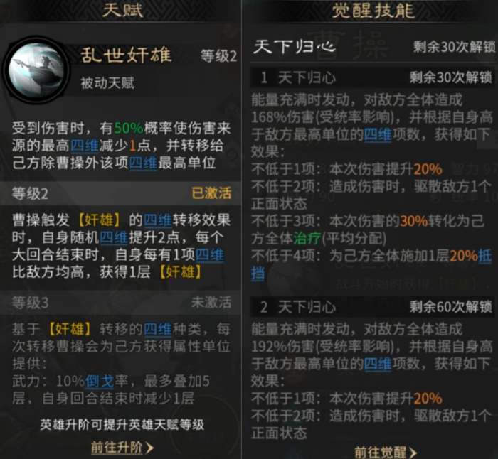 曹操的天赋【乱世奸雄】,开局自带高额减伤,受击时概率偷取敌方至高四维,并转移给我方对应四维至高的核心英雄,实现“彼竭我盈”。解锁3级天赋后质变: 转移四维时,还会根据四维类型赋予队友额外增益(如:转移武力给队友加吸血,转移统率加格挡)。