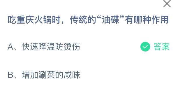 吃重庆火锅时,传统的“油碟”有哪种作用?支付宝小鸡课堂开课啦!每天花一分钟答题赚饲料,喂喂小鸡就能贡献爱心啦!轻松又意义十足!2025年11月1日蚂蚁庄园的小鸡课堂题目正确答案是【快速降温防烫伤】,油碟能够有效地为火锅中的高温食物降温,使之更适宜入口,同时保护口腔不被烫伤。
