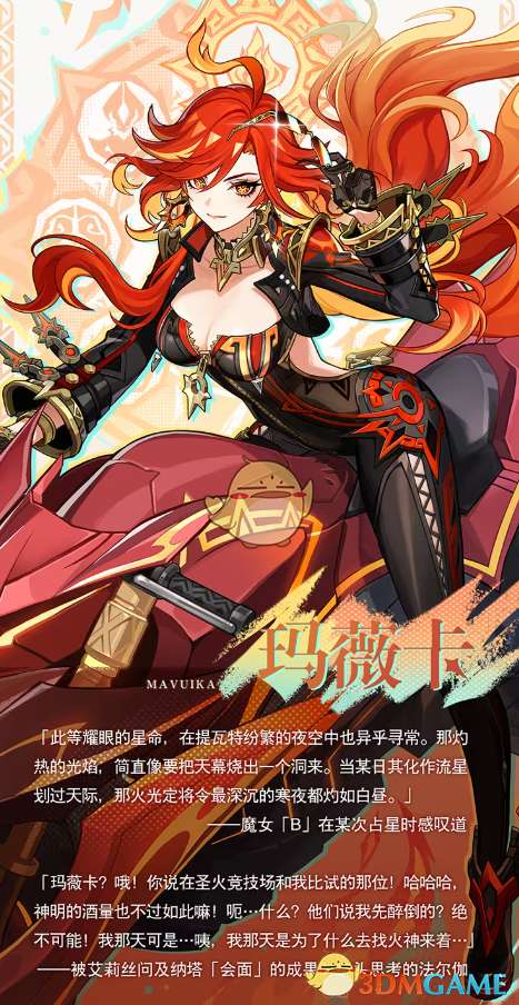 ▌焚夜以炎 · 玛薇卡 至明、至炽、至烈的再临之火 ========== 「此等耀眼的星命,在提瓦特纷繁的夜空中也异乎寻常。那灼热的光焰,简直像要把天幕烧出一个洞来。当某日其化作流星划过天际,那火光定将令最深沉的寒夜都灼如白昼。」 ——魔女「B」在某次占星时感叹道 「玛薇卡?哦!你说在圣火竞技场和我比试的那位!哈哈哈,神明的酒量也不过如此嘛!呃…什么?他们说我先醉倒的?绝不可能!我那天可是…咦,我那天是为了什么去找火神来着…」 ——被艾莉丝问及纳塔「会面」的成果时挠头思考的法尔伽 要如何介绍她?「基扬戈兹」的玛薇卡,我们纳塔人当之无愧的领袖。 织卷与长诗将此最为传奇的古名事迹一一记载。伟人层见叠出,荣耀代代相传,她从未辜负如此厚重的期望。 肩负「最强战士」之名,她尊重一切或强大或弱小的生命,一视同仁。 人们也因此爱戴她、歌颂她,发自内心地追随她。 每一次,当她为「归火圣夜巡礼」致辞,她的发丝随圣火飘动,威严的声音在我们耳边回荡。 她将鼓舞的目光投向每一位战士,每一只龙。她呼唤每一簇纳塔的火,聚燃为驱退黑暗的光亮。 当我们搀扶着漫行在无边长夜,拭干眼角泪水,艰难地抬起头—— 只看见那一抹坚毅不改的红,如旭日东升。 她牺牲了什么?她舍弃了什么?她凭借何等意志一路行至今天? 我们无不相信,她将引领纳塔走向又一场胜利。 我们的太阳永燃不息。