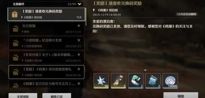 鸣潮星声及养成材料兑换码是什么,兑换码:WEARETHESTAR,有效期:2025-12-24 24:00,12月25号版本开启后,登录就能在邮箱领10连抽,7天签到能拿5个金球+5个常驻球,1月1号商店刷新后,还能兑换7个金球、7张武器票和7个常驻球,先约电台也能领5个常驻。