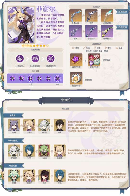 5、菲谢尔抽取建议:菲谢尔在激化队伍中十分优秀,尽管0命也算是完整的角色,但满命的菲谢尔更加强大。激化队伍需要好的命座,但如果不打激化队的话就不需要特意去捞命座。该卡池的五星质量非常优秀,但对于大多数玩家来说,钟离和龙王已经足够了(0+0或1+1的配置)。如果这两个角色没有达到这个配置,建议抽取一下。如果已经达到配置,不建议再抽取。下一个卡池是火神卡池,对玩家来说非常重要。