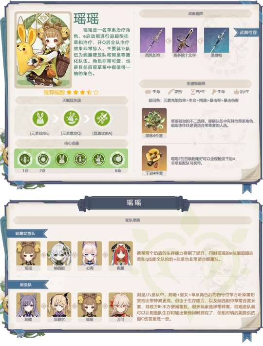 3、瑶瑶抽取建议:瑶瑶是一位草系角色,虽然命力为0,但作为一名完整的角色,可以替代草神的位置,对于萌新来说是很实用的。此外,瑶瑶还可以作为全队奶的角色,与水神搭配使用效果更佳。但如果你只是为了得到一只瑶瑶,建议不要硬着头皮去抽命座。因为在下一个版本中的海灯节,一定会有瑶瑶赠送。