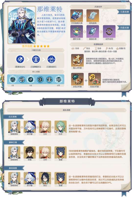 1、那维莱特抽取建议:那维莱特是第一位登上人权卡位的主C,输出能力在纳塔时代仍然不错。然而,其零命的龙王机制并不完整,因此需要带盾角色,并且必须组成四色队伍,不能带双水。此外,零命上限也很低,过于强大的机制使得龙王在深渊中远远领先。如果您要抽取龙王,我们建议您抽到1命,这将极大地优化龙王的手感和输出。如果您不打算将命力满级,我们则不建议您进行后续的升级。