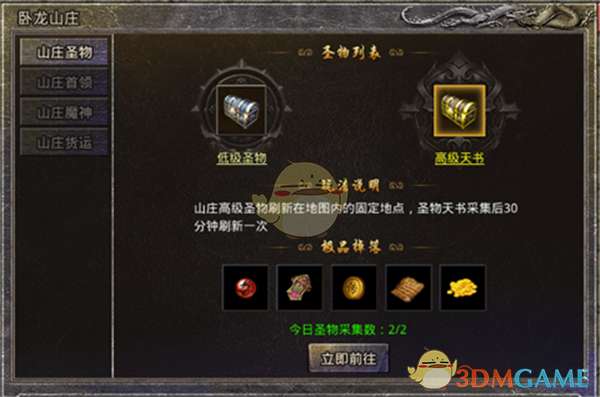 山庄高级圣物刷新在地图内的固定地点,圣物天书采集后30分钟刷新一次,采集后可以获得功勋,传奇币,技能书页,金币,高级天书有几率获得卧龙镖令,是押运高级镖车的材料
