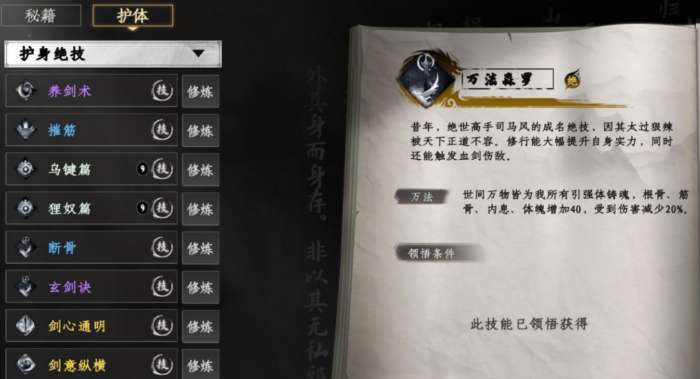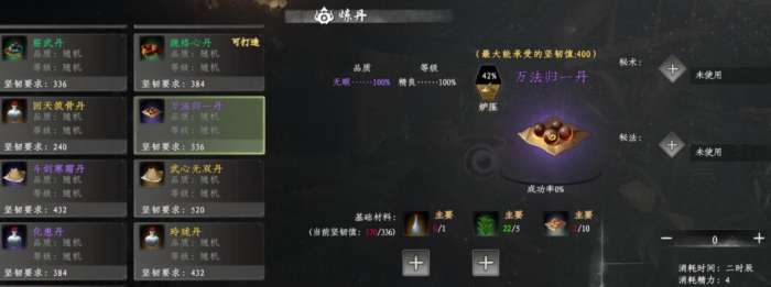 兰草和白芨则是能够直接自己采集到,当然玩家们也可以去游商那儿进行购买,注意炼制材料的数量是要和配方的数量相符合才可以炼制成功,在炼丹之前还需要注意的一点就是玩家的炼丹等级。玩家们需要达到3级或者以上才可以炼制万法归一丹,炼丹等级是炼制这个丹药的基础。经过上述的所有过程,玩家们就可以获得一颗万法归一丹了,在使用万法归一丹之后,玩家们还可以在触发的几个剧情后学习到万法森罗这个功法。万法森罗的功法也是对玩家们非常有利,让玩家角色的各方面属性都获得大幅度的提高,输出方面也是跟着增长,可以说万法归一丹的效果非常显著了。