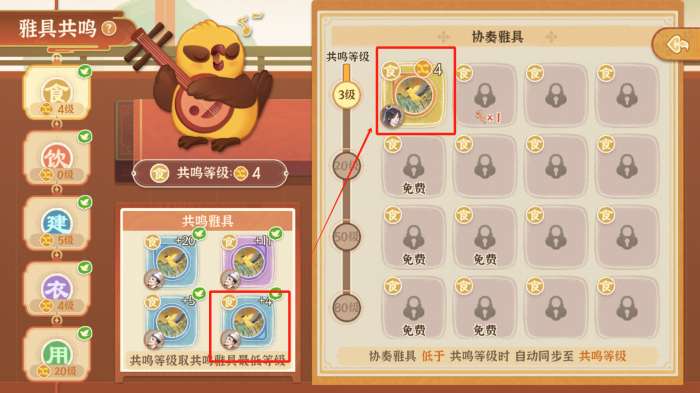 (1)共鸣雅具等级由槽位上雅具的最低等级决定,因此共鸣槽位优先全部选择等级上限高的高品级雅具;