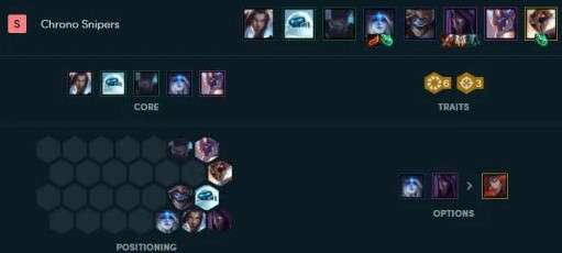 这里我们需要5张费卡,组成4时旅者羁绊2狙击手羁绊,这是一套典型的输出过渡体系,时旅者羁绊给予全体收益搭配狙击手羁绊,可以瞬间融化敌人的过渡体系。同时值得一提的是,过渡体系有一个输出点寒冰,大家可以给予部分装备进一步提升阵容输出战力。