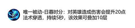 日暮之流:可以持续叠加法术穿透,适合伤害频率高的英雄,比如:貂蝉、安琪拉、高渐离等英雄。
