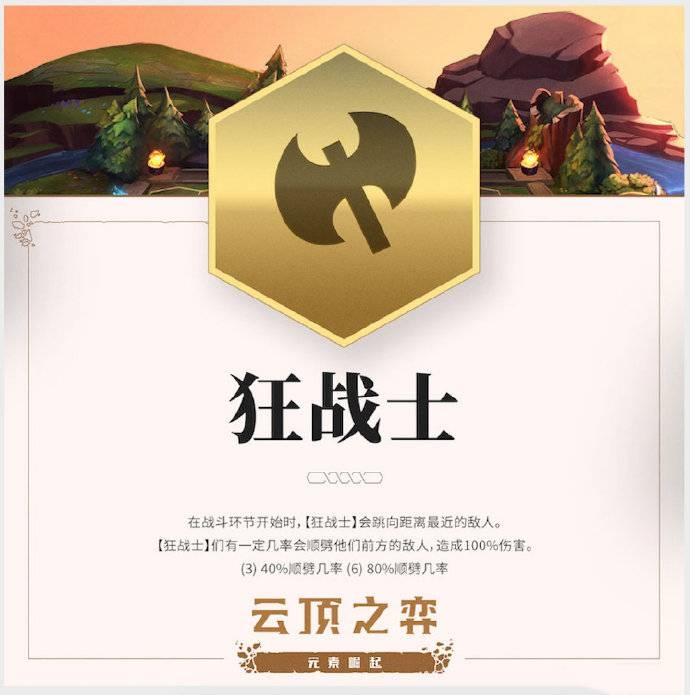 (3/6)狂战士:在战斗环节开始时,【狂战士】会跳向距离最近的敌人。【狂战士】们有40/80%几率会顺劈他们前方的敌人,造成100%伤害。