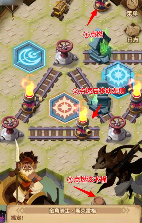 挑战后,根据下图所示,点燃下方的炮台,并移动到左侧,点燃下方的木桶。