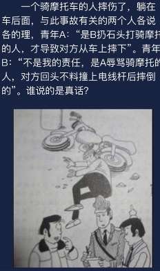 如果B说的是真话,撞到电线杆后摔倒,不会摔倒在车后面,而是弹到前面。