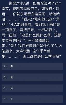 图上的东西看起来毫无关联,其实把它们组合起来就会发现它们是雪人的组成部分,只不过雪融化了,它们掉在了地上。既然雪人是融化的,那么应该是春天。