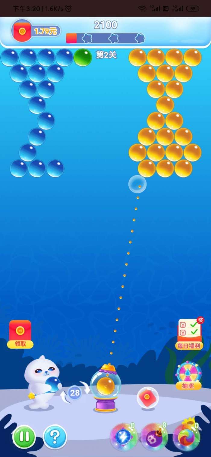 C.通关,或者消除带有红包的泡泡,就有红包奖励。我通过第一关,领到了2.09元红包;