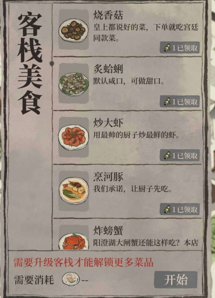 客栈可以通过消耗资源满足客人需求获得香料,通过消耗指定香料完成菜品,获得好评空碟,好评空碟可以用来解锁新菜品,升级客栈,升级香料仓库