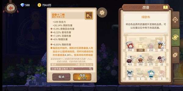 这个武器就是先提前鉴定出一堆重型火炮,然后去魔法石那里,先灰炉渣降到白板武器,再用绿欧布随机升阶。这里建议超过100次就换把继续吧,100次后就要1w金币一次改造了。