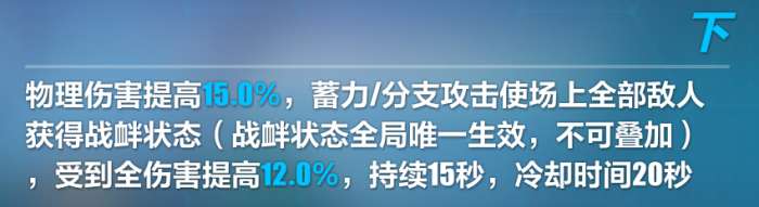三件中最重要的部位,无条件15%物伤加成提升了输出能力,蓄力/分支可以使场上的所有敌人进入战衅状态,受到全伤害提高12%。数值虽然不高,但持续时间长达15秒,且打中一个敌人就可以对全场生效,辅助能力极强,同样非常契合增幅影舞长线辅助的特性。