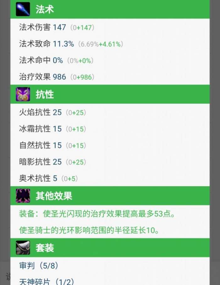 现阶段奶骑分两个流派1.散件布皮混合流派,2.5T2和3散件板甲流派。这个奶骑明显就是走全板甲流派,三围,护甲,抗性,治疗效果,5回都有。差187奶锤和殉难之戒毕业,毕业了就有986治疗效果和67回蓝。还是全板甲奶骑性价比很高,平民玩家的福音,而散件奶骑会为几件装备打的头破血流,真心不值得。