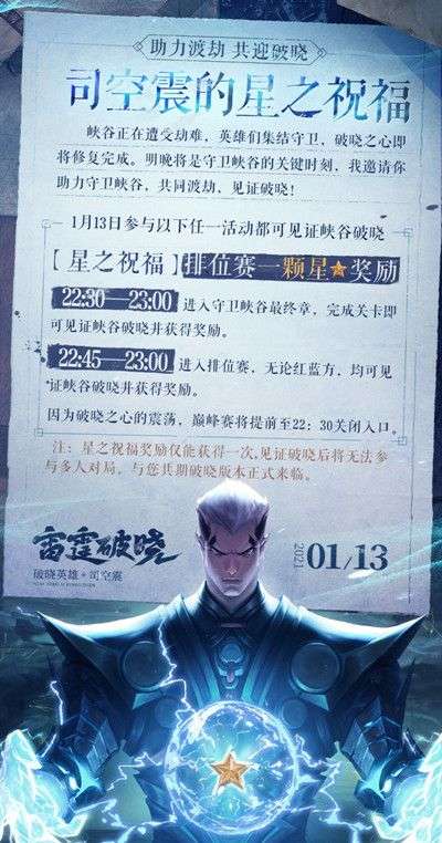 1月13日22:45—23:00进入排位赛,无论红蓝方,均可见证峡谷破晓并获得奖励。