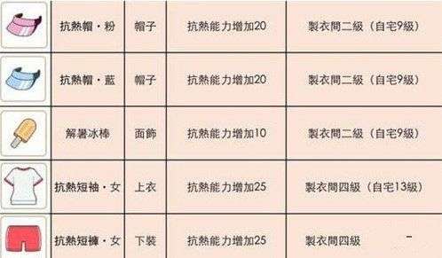 这段时间属于炎热的天气,玩家可以穿戴具有抗热属性的衣物,目前在游戏中的抗热衣物有: