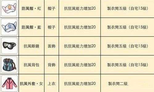 在木灵峡谷中还有狂风天气,可以穿增加防风属性的衣物,其中制衣间2级可以制作防风外套和防风裤,5级后可以制作防风帽、抗风眼镜、抗风背包。