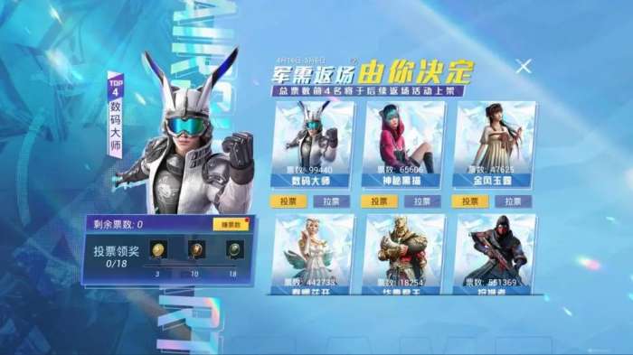 截止到发文时间为止,暂时排在前4名的套装,分别是:奇异狩猎者系列、春暖花开系列、粉色回忆系列和数码大师系列。(票数每10分钟刷新一次)