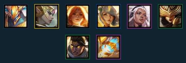 从左到右英雄:亚托克斯(1)、蕾欧娜(1)、辛德拉(1)、韦鲁斯(2)、拉克丝(3)、芮尔(4)、维克兹(4)、凯尔(5)