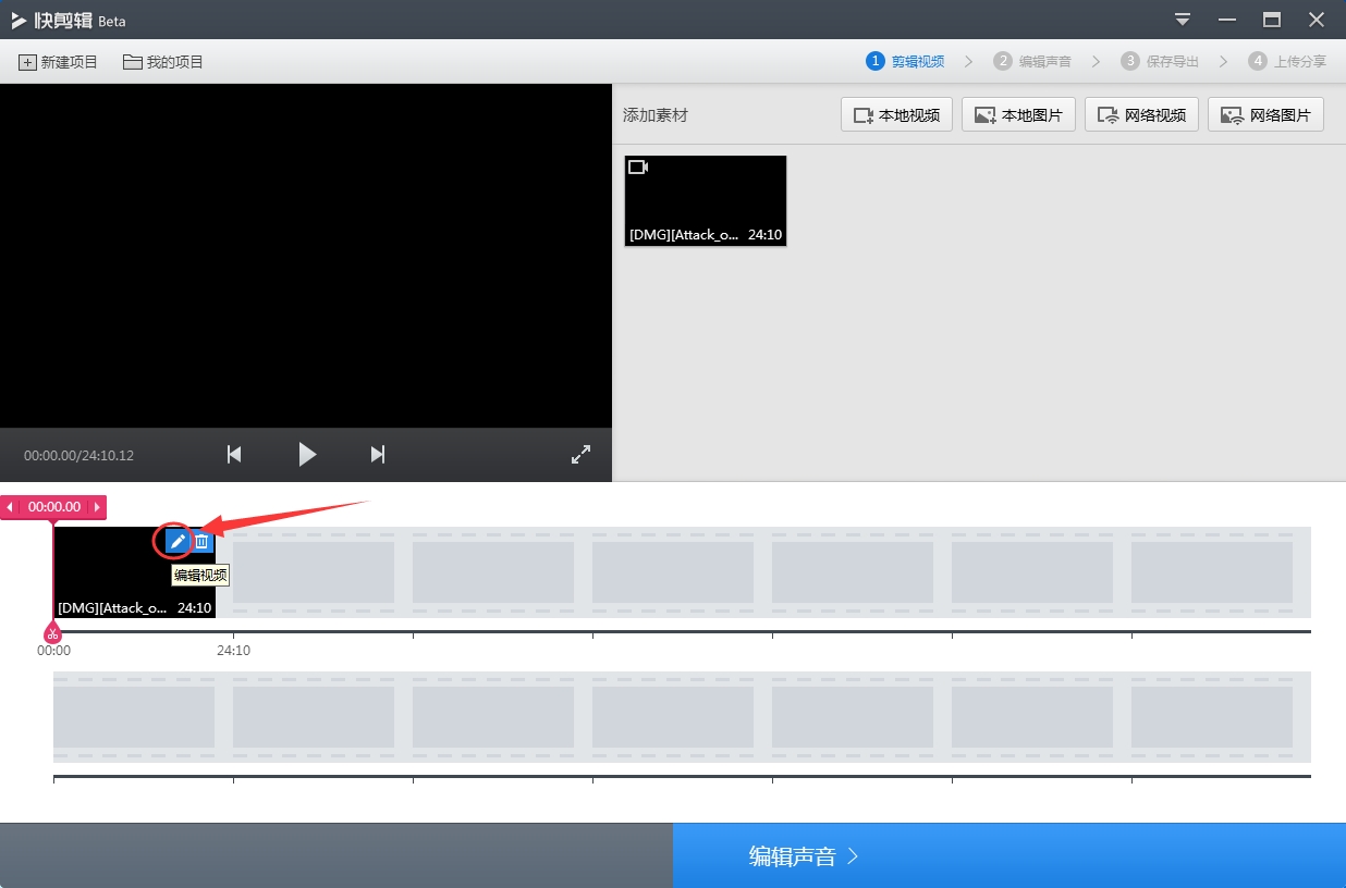 2、添加完视频后,在快剪辑的视频素材列表中就能看到刚才添加的视频了,这时点击该视频右上角的“编辑视频”按钮;