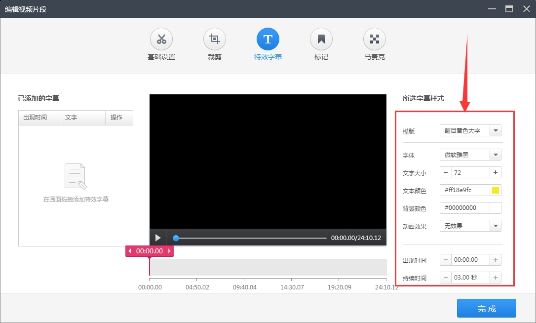 3、在“编辑视频”的“特效字幕”界面就可以给视频添加字幕了。该界面的右侧可以调整字幕的各种属性,比如:模板、字体、大小、颜色、出现时间、持续时间等;